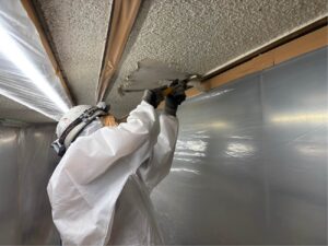 アスベスト除去の現場では、作業員がアスベストを吸い込まないように、さまざまな対策を組み合わせて作業を行います。
